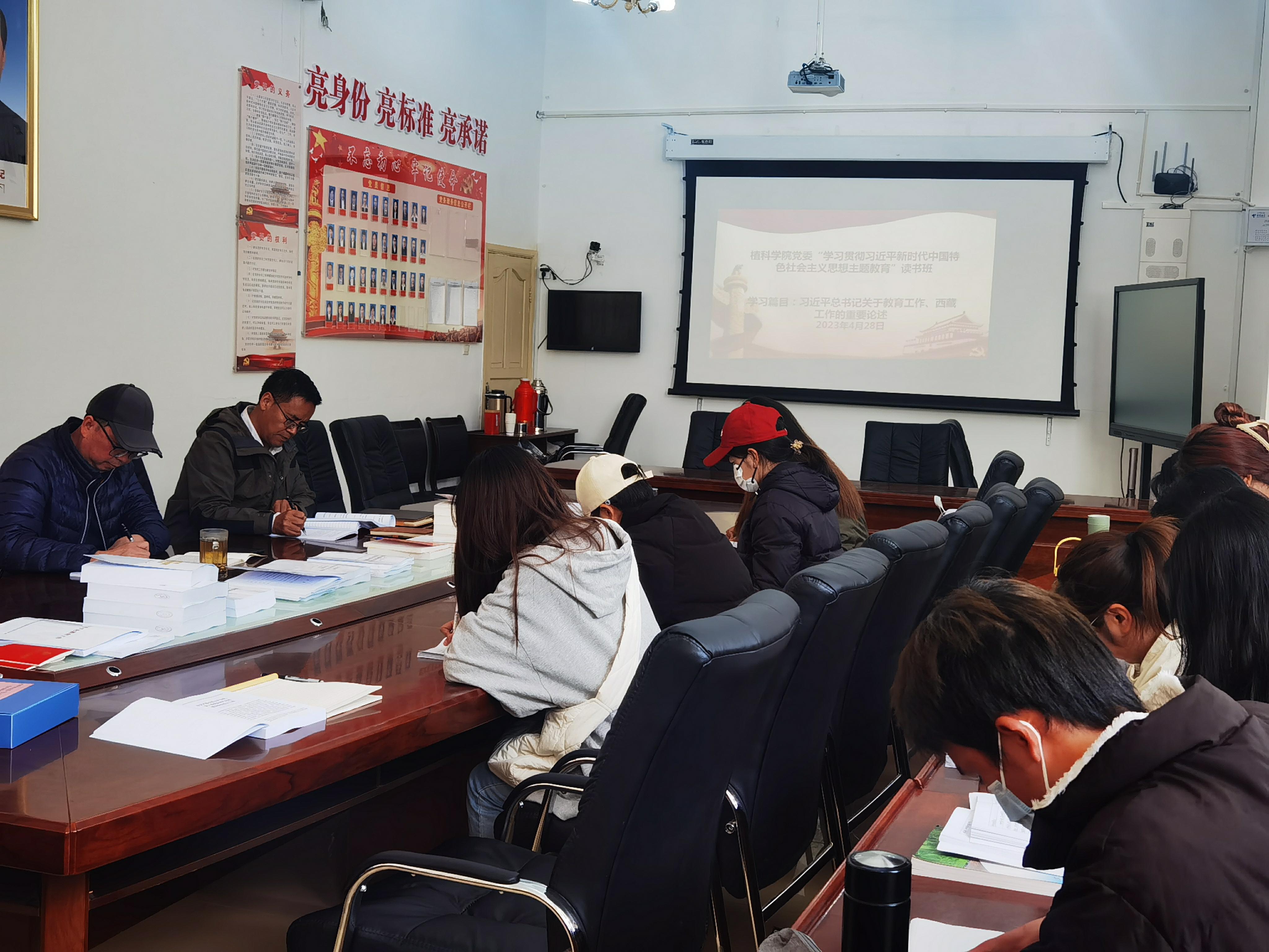 为深入开展学习贯彻习近平新时代中国特色社会主义思想主题教育,4月28日上午,植科学院师生党员读书班研读活动在党员活动室如期开展之中,本次读书班学习篇目是“习近平总书记关于教育工作、西藏工作的重要论述”。上午11:30许,学院党委书记达瓦、宣传委员董爱荣来到学习现场与大家一起学习。在看到大家紧扣主题认真学习的场景,为了提高大家的学习效果,达瓦以“加强民族团结,铸牢中华民族共同体意识”为题,给大家做了专题辅导。