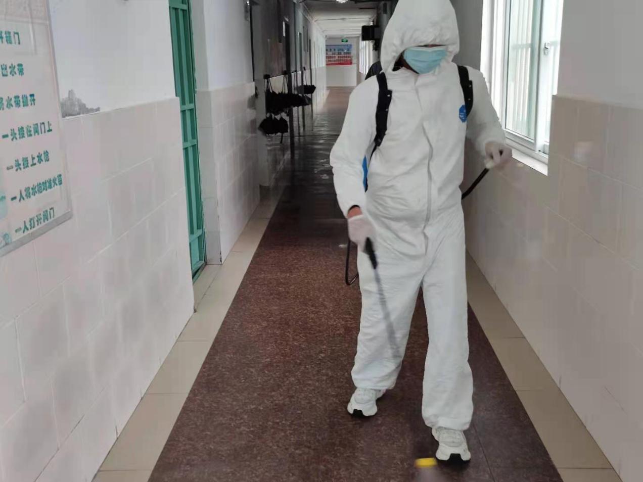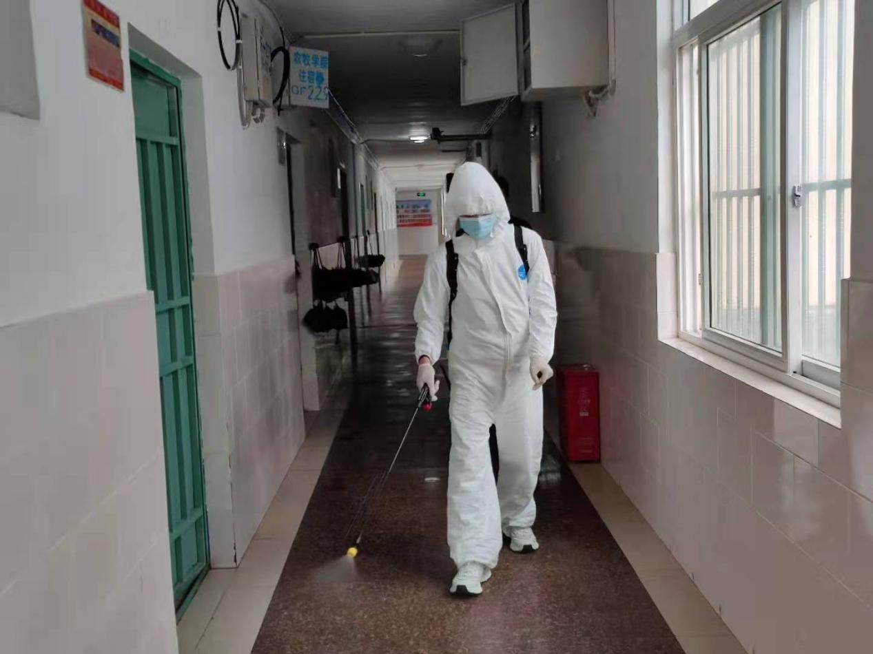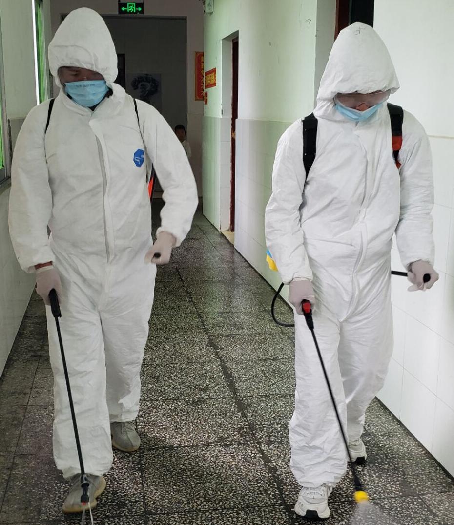 党员工作站站长郭正源以及宣传委员王悦两名同志利用中午大家休息的时间,佩戴工作证、身着防护服,佩戴防护装备(眼罩、口罩、手套),携带2台喷雾机,严格按照操作规范、按比例配兑消毒液分别对3幢、15幢整栋楼以及11幢2、3楼,19幢4、5、6层楼梯间、过道、走廊各区域进行全面消毒,不留死角,不留盲区,实实在在为学生的健康安全保驾护航,杜绝病毒传播或残留,防止疫情的传播蔓延。