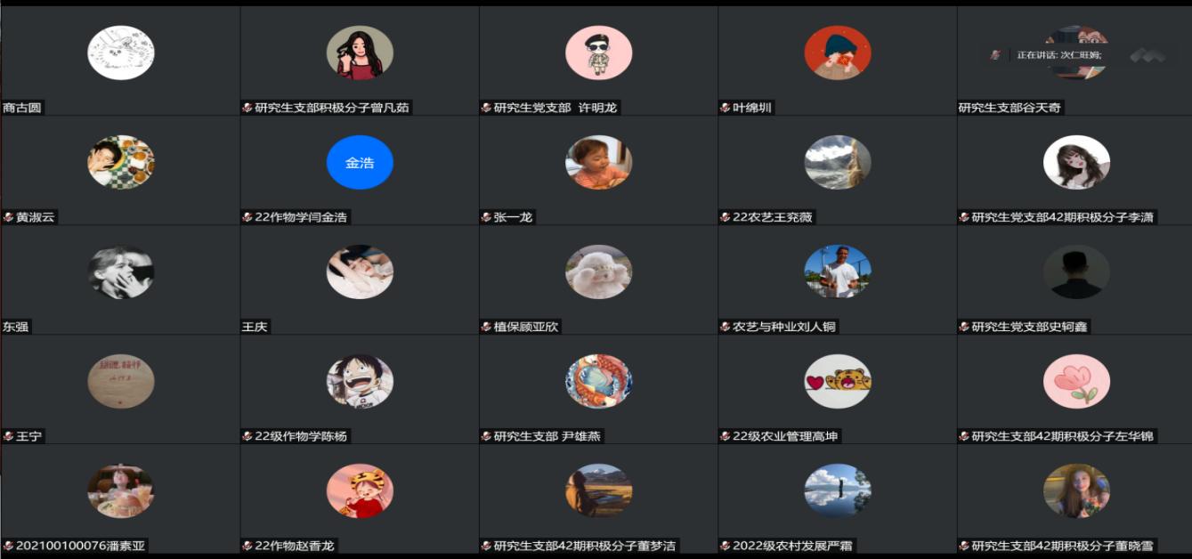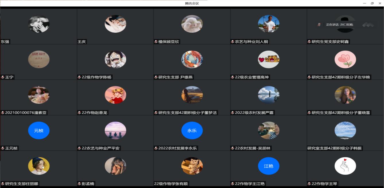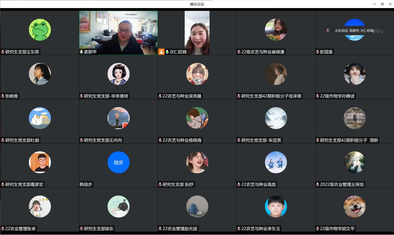 为深入学习党的二十大精神,进一步加强党支部全体党员、预备党员、入党积极分子的党性修养,2022年12月01日上午10:00,植科学院研究生党支部通过腾讯会议在线上开展了以“用伟大建党精神滋养党性修养”为主题的二十大精神学习宣讲会,由学校党委宣传部刘毅老师主讲,研究生党支部书记次仁旺姆主持,党支部80余名同志参加了活动。