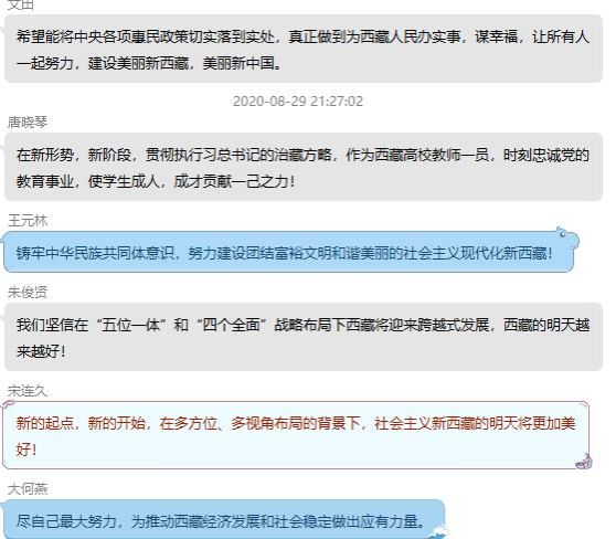 通过本次学习,我院师生纷纷发表感想,面对新形势新任务,必须全面贯彻新时代党的治藏方略,坚持统筹推进“五位一体”总体布局、协调推进“四个全面”战略布局,铸牢中华名族共同体意识,坚持中国共产党的领导、增强“四个意识”、坚定“四个自信”、做到“两个维护”及推进生态文明建设的重要性、努力建设团结富裕文明和谐美丽的社会主义现代化新西藏。