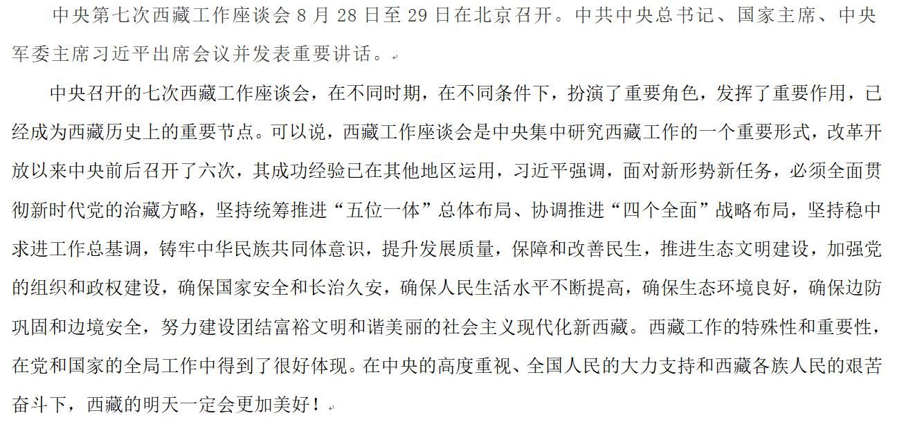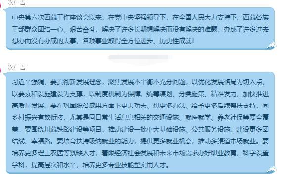 大家纷纷表示,中央第七次西藏工作座谈会在是决战决胜脱贫攻坚、西藏自治区成立55周年之际召开的一次十分重要的会议,充分体现了以习近平同志为核心的党中央对西藏工作的高度重视、对西藏各族人民的深切关怀,对西藏发展稳定各项事业具有重大意义。