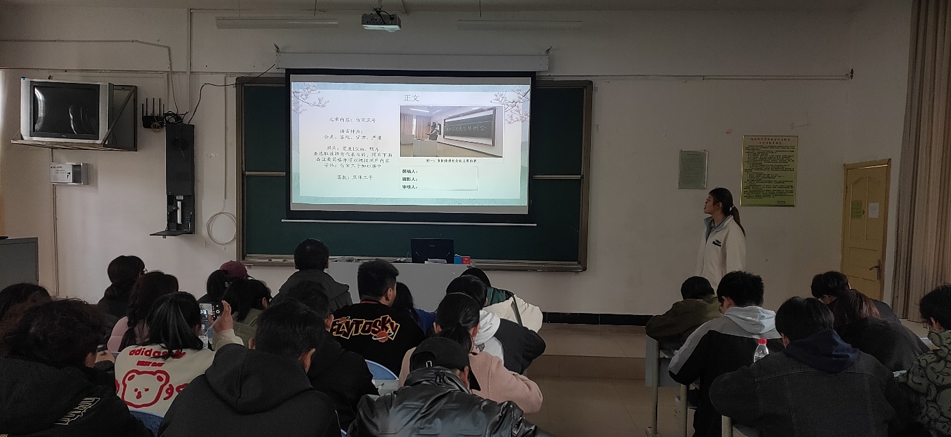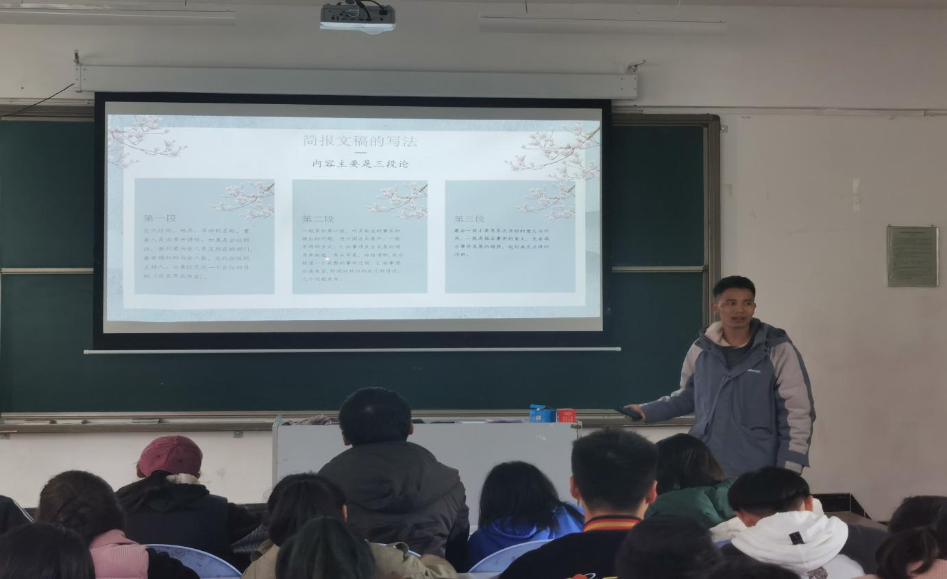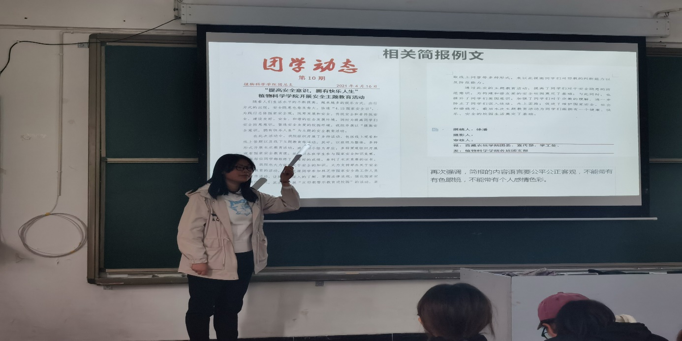 为了更好的提升学生干部的简报写作能力,方便开展后续工作,加强简报撰写的规范性及科学性。我院于2021年4月21日14:00,在第二教学楼102教室开展青马工程培训班暨“青春向党,奋斗强国”主题团日活动。本次主题团日活动主要进行公文写作类培训,由秘书处副部长王丙泉主持,黄勇和徐潘进行讲解,团总支全体成员及入团积极分子参加本次培训活动。