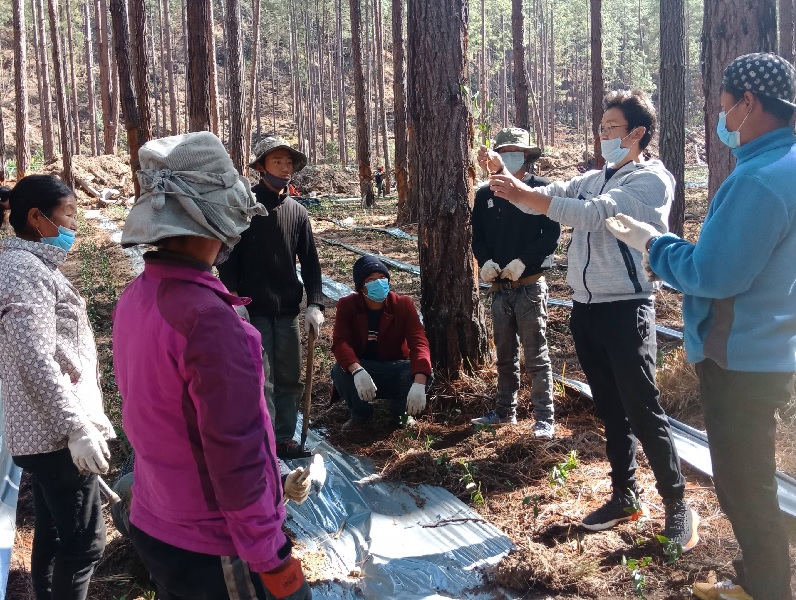 图1 白玛益西(右二)讲解茶苗栽种技巧