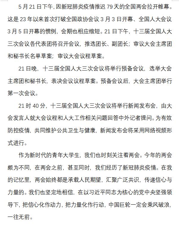 四海接力风帆劲,春风拂面笑颜开。2020年在面对新冠肺炎疫情的考验下,我国取得了阶段性胜利,国家一年一度的“两会”于5月21日在北京拉开大幕。为更好的学习宣传贯彻“两会”精神,进一步增强广大师生的政治意识、大局意识和责任意识,我院积极组织全体师生干部、教工、党员、学生通过网络直播、语音广播、学习强国等平台进行认真学习“两会”精神,推动“两会”精神在广大师生中入脑入心、落地生根。