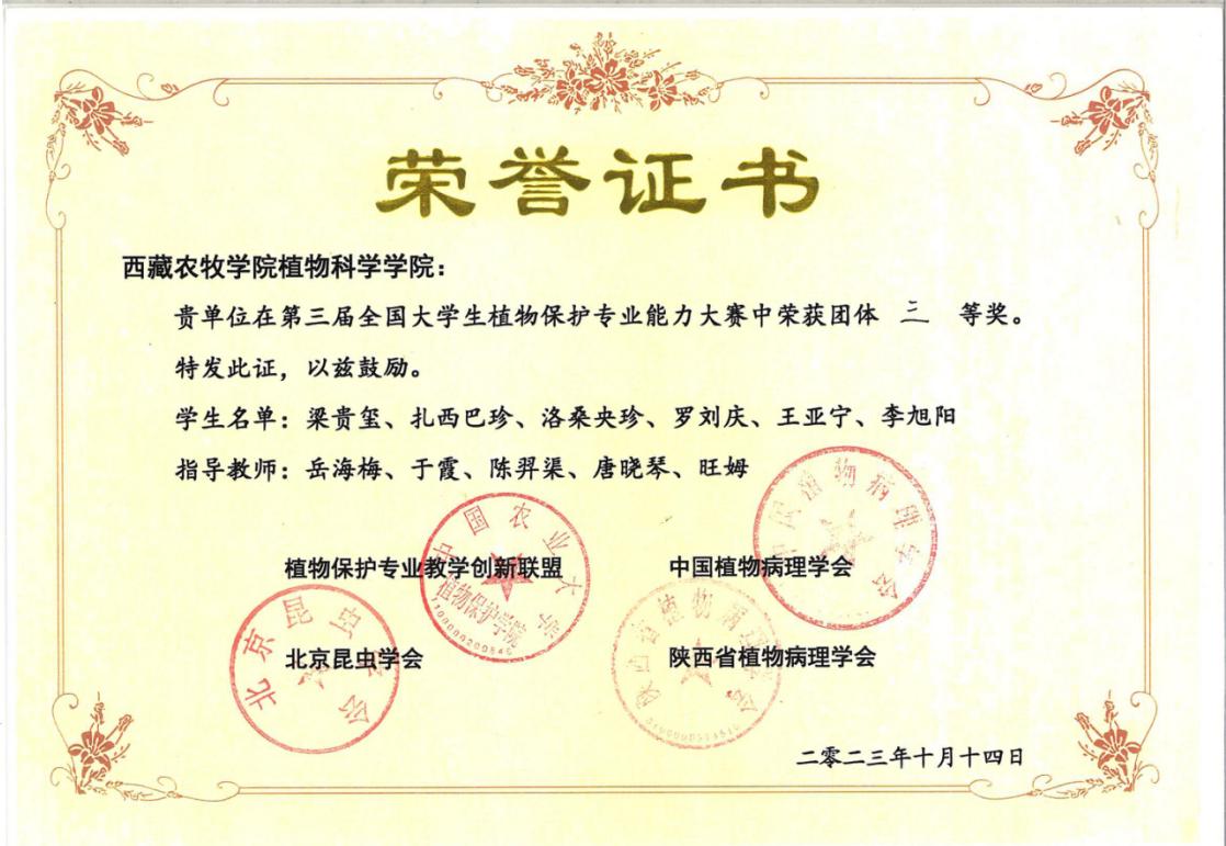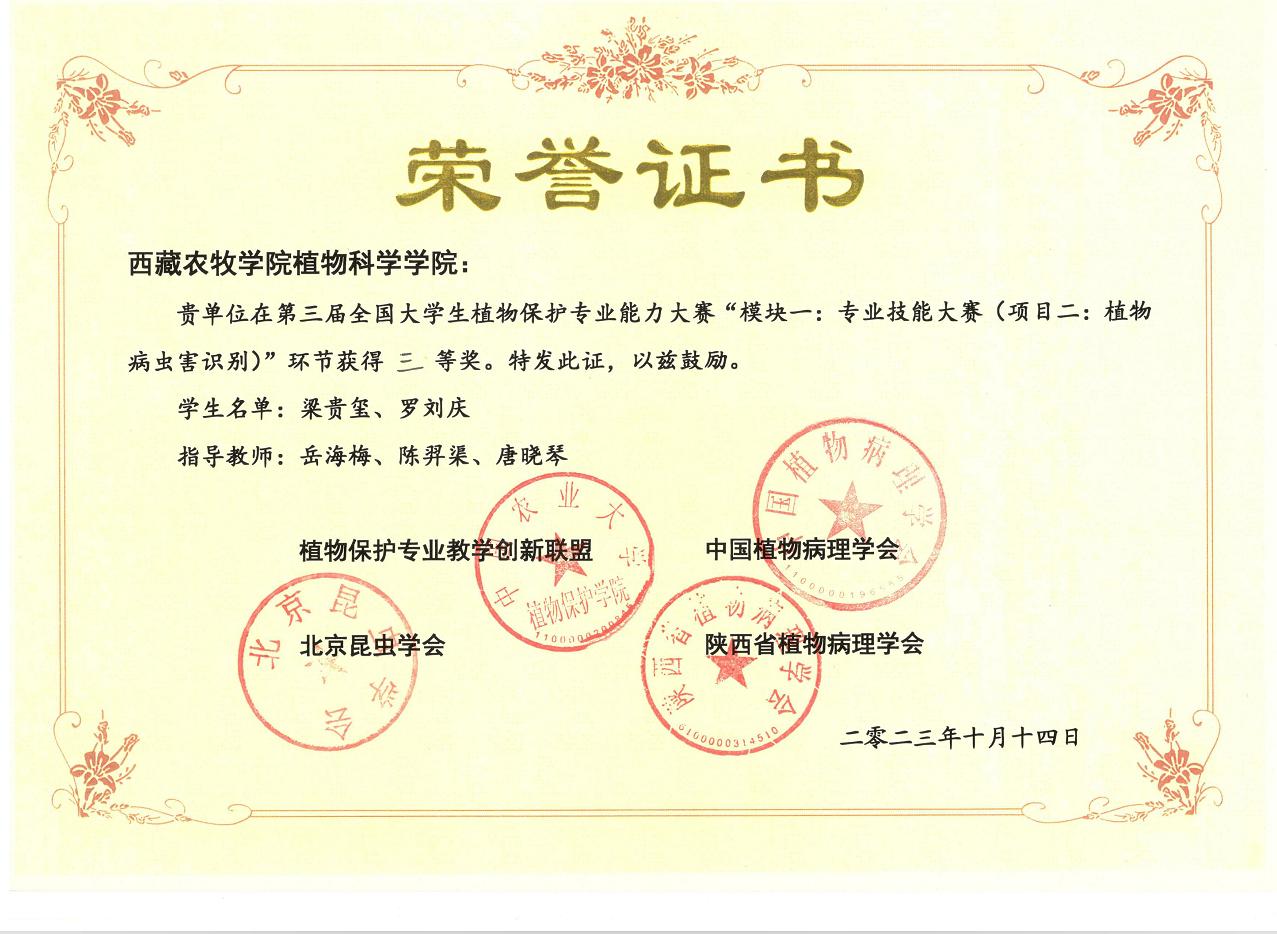 经过2个多月的紧张备战,参赛学生不间断操练、带队教师和指导教师反复推敲完善各比赛环节PPT,克服试验材料西藏不发货等重重困难、在植保教研室全体教师的共同努力下,参赛学生斩获植物病虫害识别三等奖和团体三等奖。