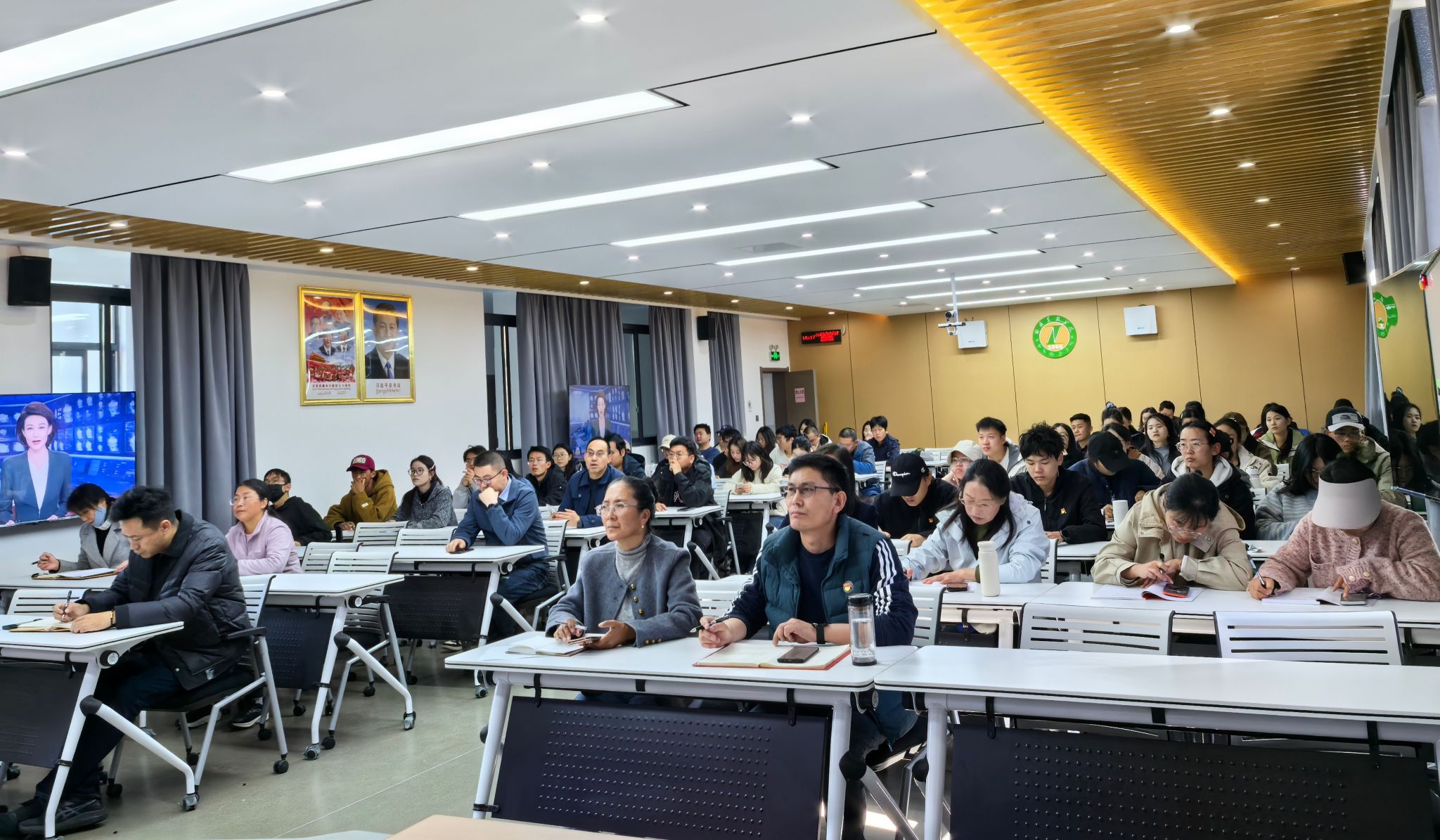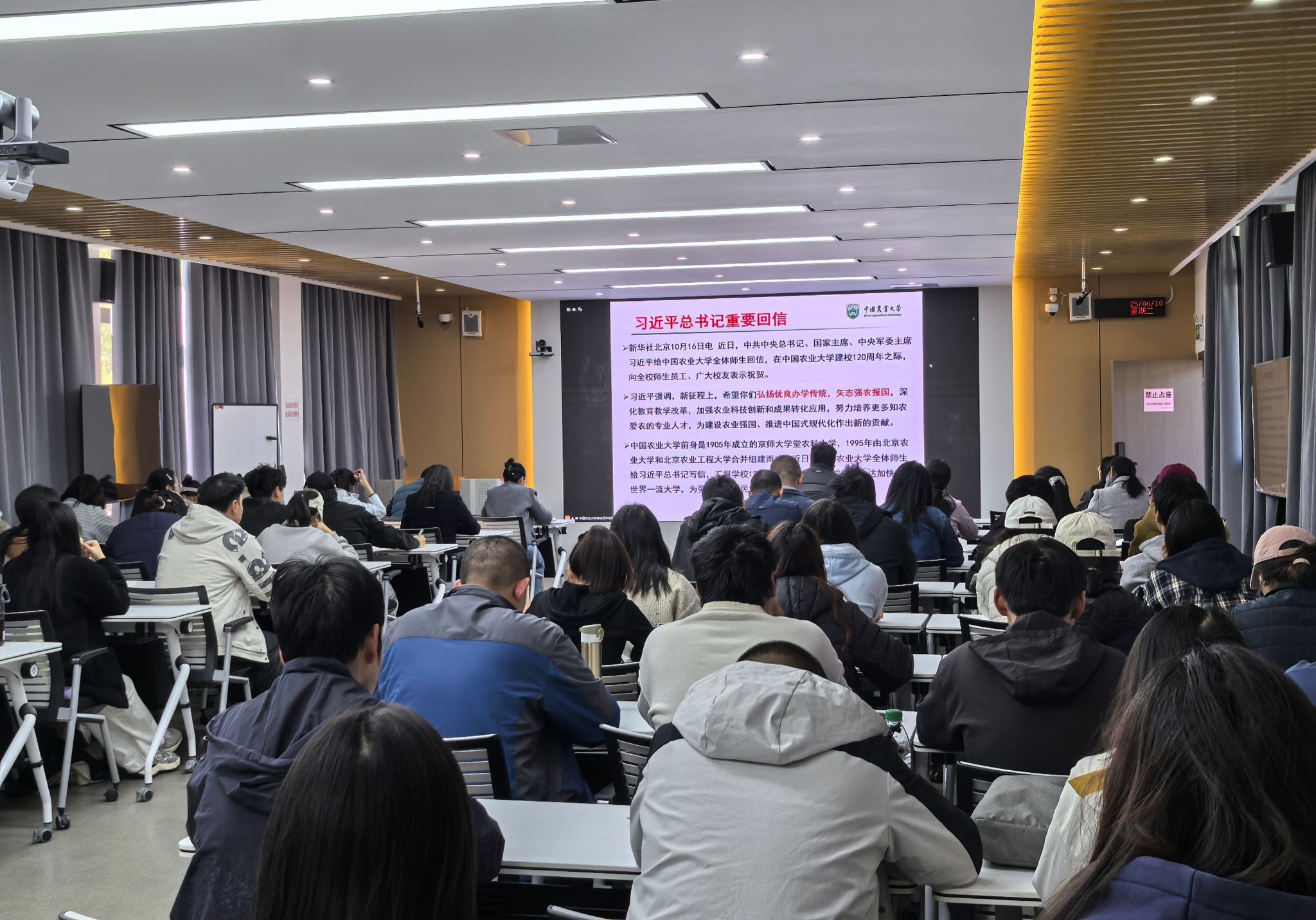 习近平给中国农业大学回信精神,给设农高校发展指明了方向,对于落实教育根本任务、服务国家战略、推动高校改革发展等方面具有重要意义。为深入学习贯彻习近平总书记给中国农业大学回信精神,深刻领会回信的精神实质和丰富内涵,全国植保联盟开展学习活动,由中国农业大学主办,全国44所高校设分会场。植物科学学院党委2025年10月22 日14:00,组织师生党员在2308智慧教室参加分会场学习活动。全体在家学院领导、师生党员60余名参加学习。所管校外科技小院、无课师生在线上直播学习。