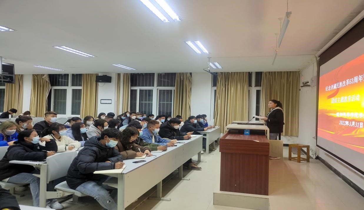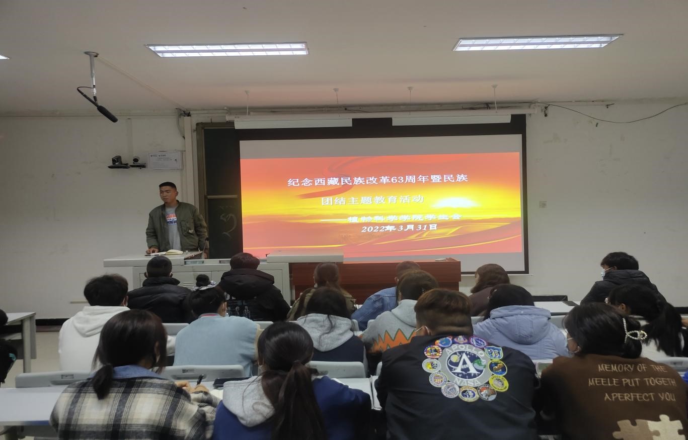 2022年是西藏民主改革和百万农奴解放第63周年,民主改革是西藏历史上最伟大最深刻的社会变革,为西藏开辟了光明的发展前景。63年来,西藏经济社会实现全面发展,人民生活极大改善,特别是党的十八大以来,以习近平同志为核心的党中央高度重视西藏工作,习近平总书记亲自为西藏工作把舵定向、谋篇布局,西藏步入发展最好、变化最大、群众得实惠最多的新时代,各项事业取得全方位进步、历史性成就。植物科学学院学生会于2022年3月31日在第四教学楼104教室宣传与学习1959年西藏民主改革的历史背景和重要意义。本次活动参加人员有植物科学学院学生会分管老师次仁旺姆以及学生会全体成员。活动由次仁旺姆老师主持。
