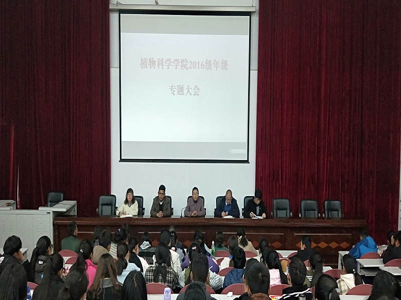 为帮助我院学生树立正确的人生观、价值观、世界观,树立高尚的职业理想,转变就业择业观念,对自己的未来有所规划,加强我院学生的日常工作管理,养成良好的生活习惯、学习习惯。植物科学学院于2019年4月24日下午18:00在2107组织开展2016级年级专题大会,学院党委书记次仁吉、副书记王元林,学生科辅导员毛小军、秦丽、罗定一及全体2016级学生参加会议,会议由学生科辅导员秦丽主持。