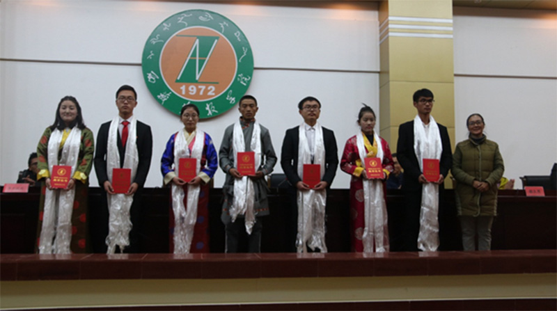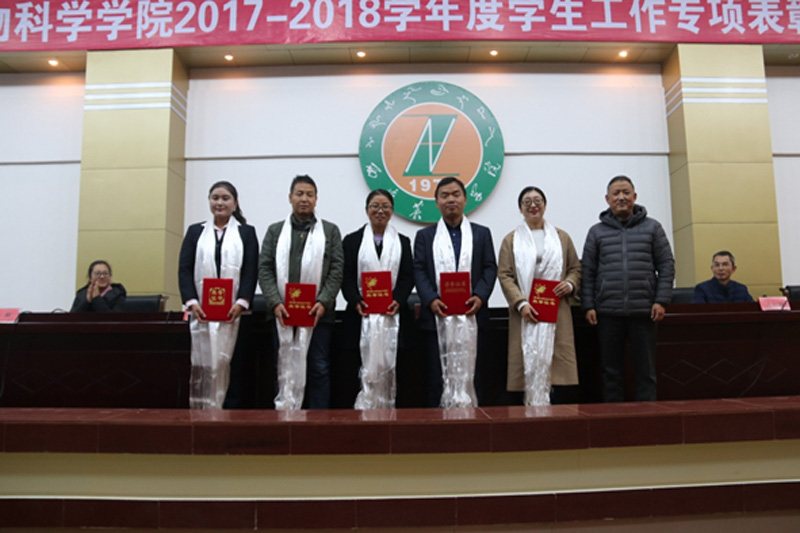 接着,全体起立,奏唱国歌。学生党支部副书记:孔佑淳,团总支副书记:旺堆,学生会主席:西热朗达分别代表学院作了我院2017-2018年度学生三大社团工作总结报告;达红旗副院长宣读了《植物科学学院关于2017-2018学年度学生工作先进集体和先进个人的表彰决定》;与会领导为获奖代表颁发了荣誉证书并合影。