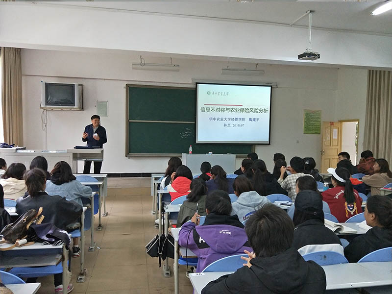 应农经教研室邀请,华中农业大学陶建平教授于2018年7月10日上午在2101教室对2015级和2016级农林经济管理专业的90多名学生做了题为《信息不对称与农业保险风险分析》的精彩报告。