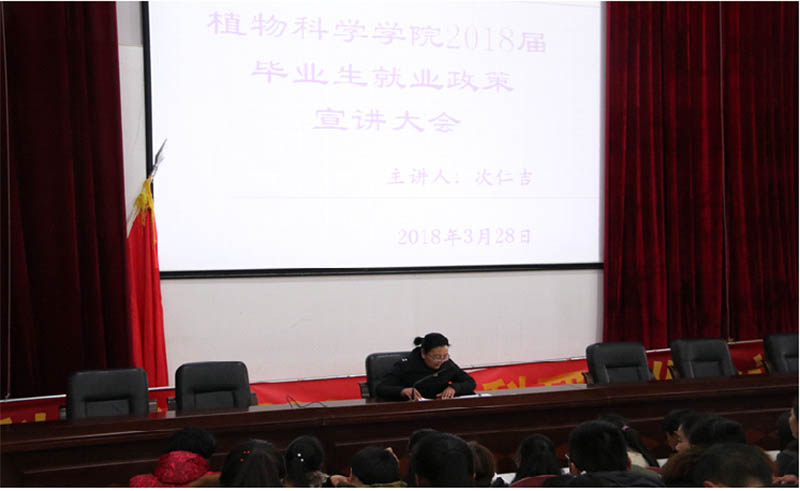 2018年3月28日下午3:30,植物科学学院组织开展毕业生就业政策宣讲活动,由植物科学学院党委书记次仁吉同志主讲,我院在校14级毕业生共195人参加活动。