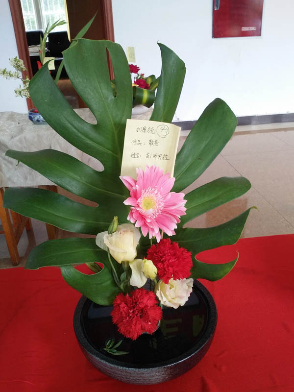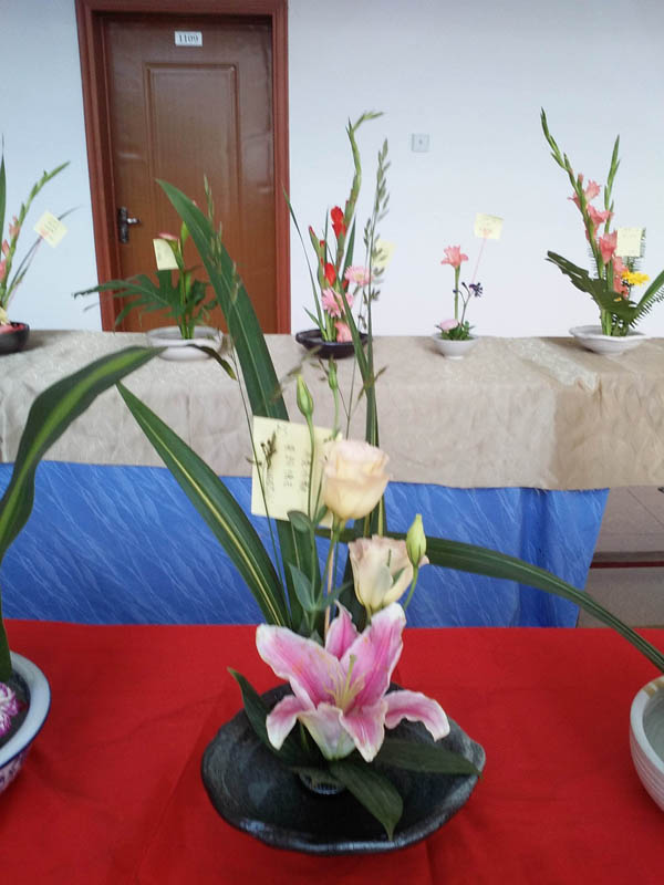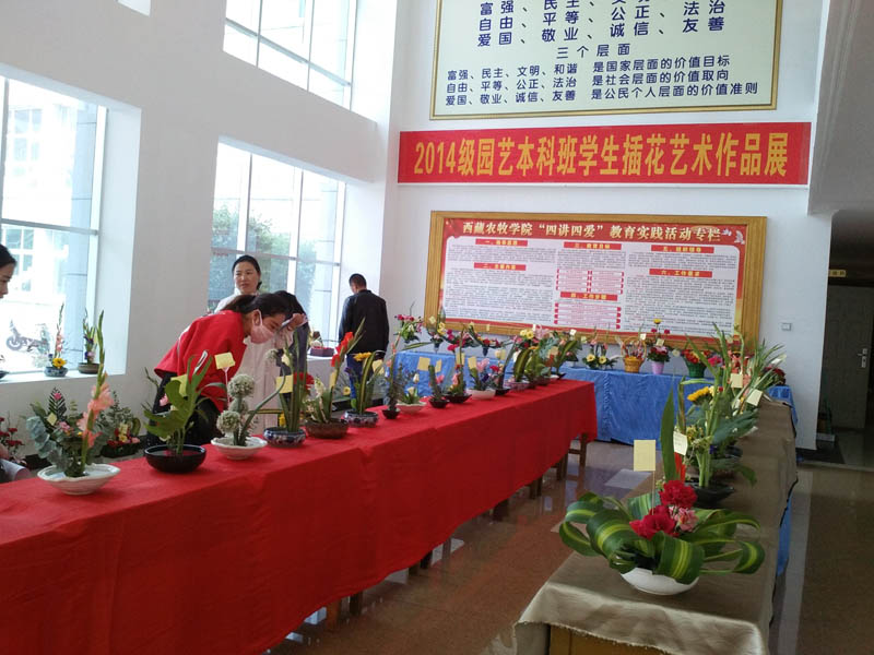 此次插花主要以东方式插花为主,同学们自由发挥。流派基本为小原流。在这次插花艺术作品展上,同学们将各种奇思妙想体现在花卉艺术上,并且,同学们给自己的作品取名也特别诗情画意。我院党委书记次仁吉老师也来到现场参观。看着同学们完成作品的认真模样,次仁吉书记也不禁动手插起花来。2105教室的空气中弥漫着浓郁的花香,在德庆措姆老师的指导下,同学们利用校园中搜集枝、叶、花,通过修剪、整枝、弯曲等技巧将一个个零散的“部件”重新配置成一件件自然美与生活美并存的插花艺术作品。插花作品置于学校行政一楼,供全院师生观赏,并由相关专业老师进行评比。